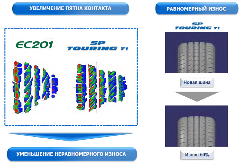 Специальные компоненты резиновой смеси использованные при производстве Dunlop SP Touring T1 повысили износостойкость на 10% и улучшили управляемость на влажной поверхности, а использование полимеров нового поколения позволило повысить сопротивляемость абразивному износу и механическому воздействию.