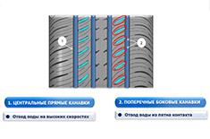 Четыре больших продольных канавки изогнутой формы, превосходно отводят излишки воды повышая сопротивление к аквапланированию.