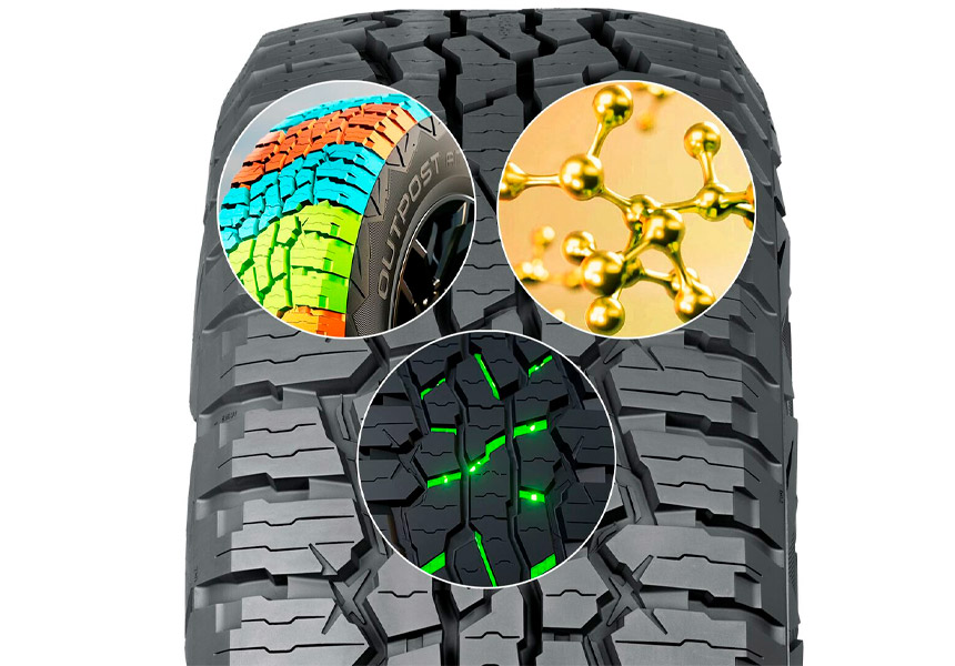 Вседорожные шины NOKIAN Tyres Outpost AT – покорители сложных дорог и бездорожья, которые обеспечивают отличные ходовые характеристики и безопасность на любом покрытии. Предназначены для оснащения тяжелых внедорожников, городских кроссоверов и легкогрузовых авто. Каждый элемент шины и конструкторские решения выполняют свою функцию, тем самым поддерживая высокие характеристики вождения в любых, даже самых экстремальных условиях.