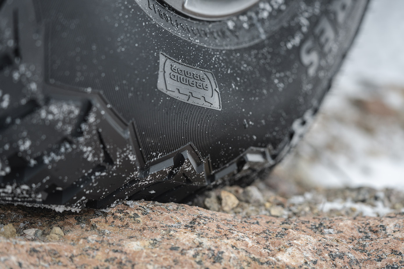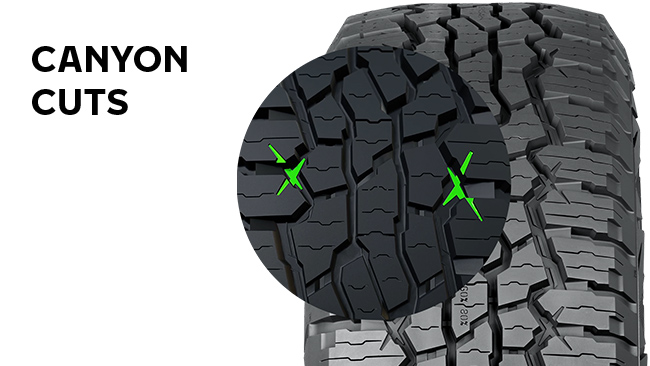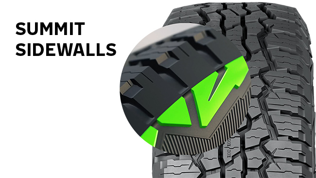 Дизайн протектора разработан для идеального поведения автомобиля на любой дороге. Агрессивные шашки плечевых зон Summit Sidewalls способствуют выгребанию из сложных и рыхлых участков, инновация Canyon Cuts – х-образные канавки, обеспечивающие высокое сцепление на непредсказуемых покрытиях. Широкое расстояние между блоками протектора не дают задерживаться грязи и воде, что также способствует повышению управляемости в разных погодных условиях.